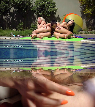 Lesbo interracial hookup by the swimming pool and on a red sofa inbetween two skinny atractive girls